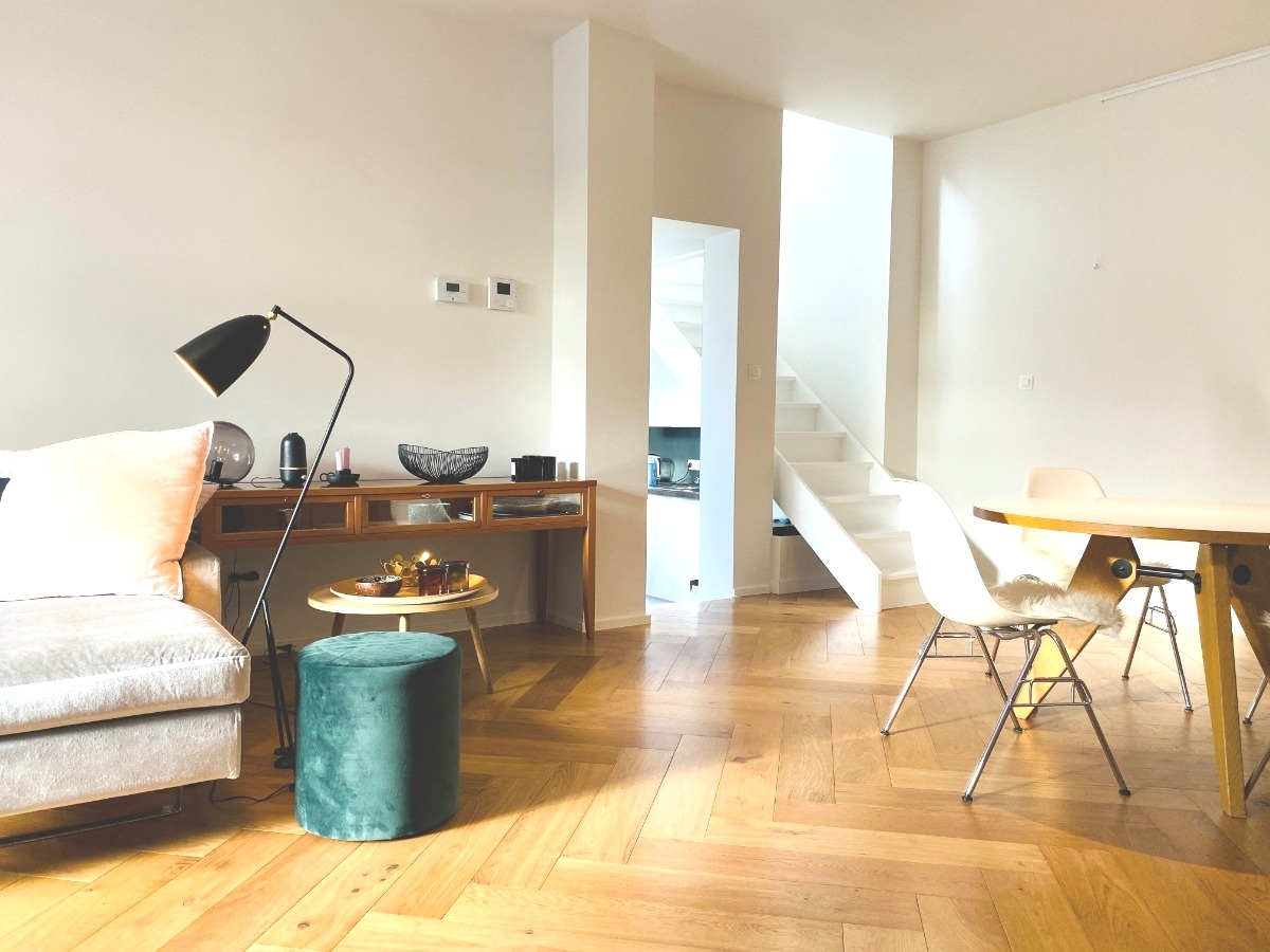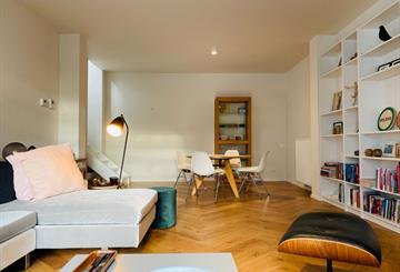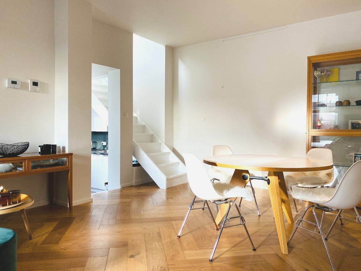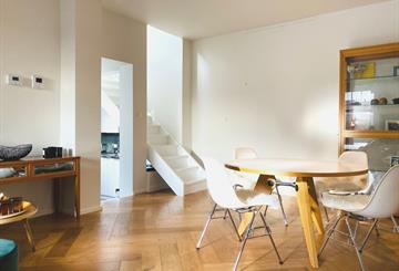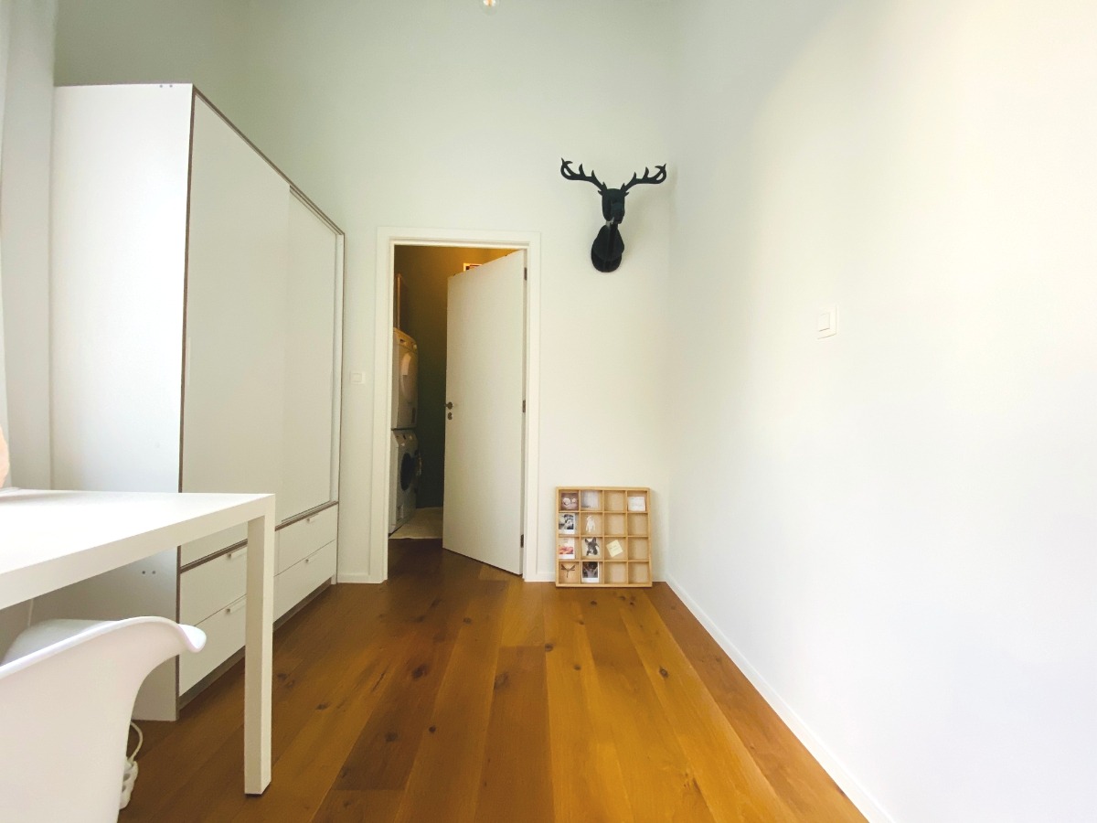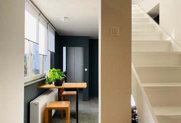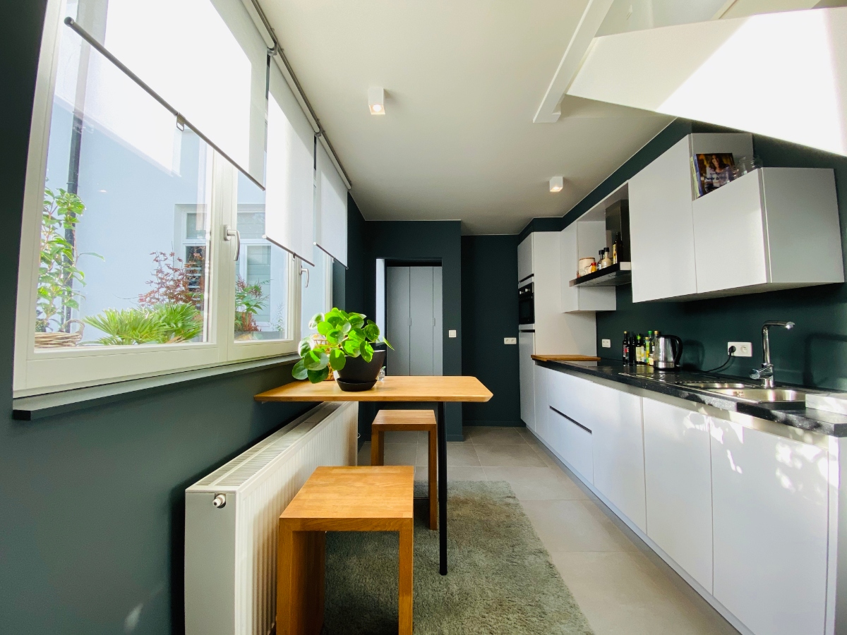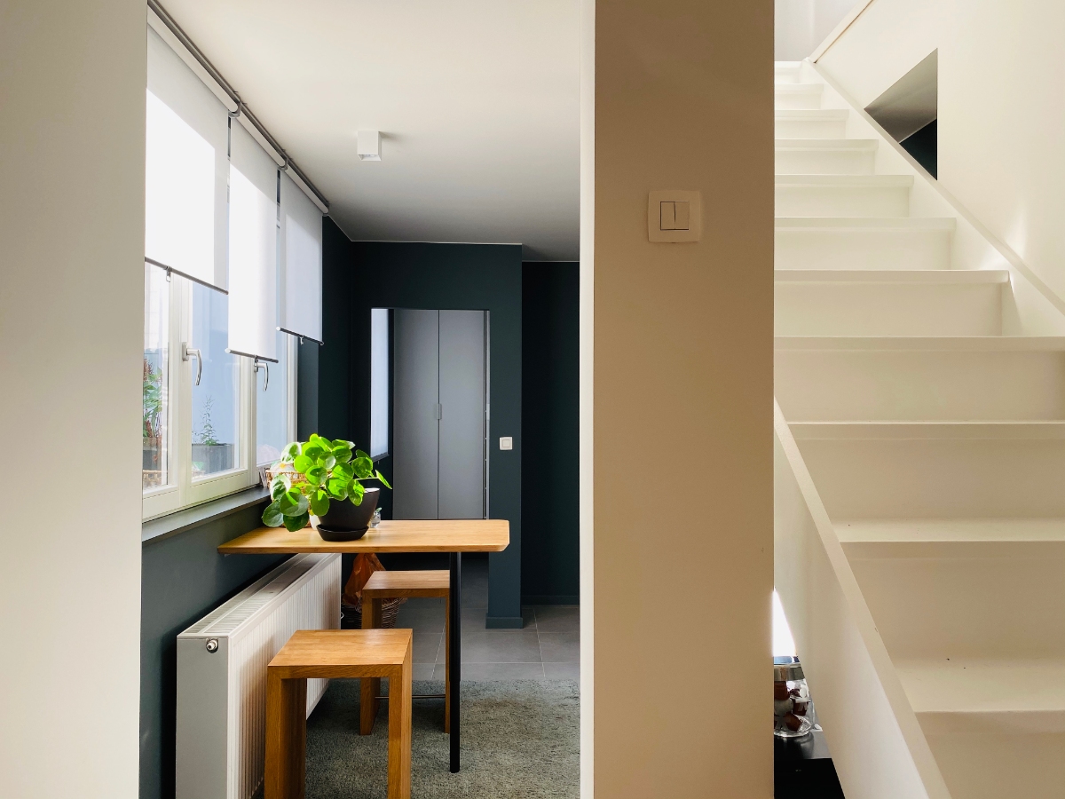 Stijlvol en volledig gemeubeld design-duplexappartement van ca. 95 m² in Schaarbeek, op wandel- en fietsafstand van Josaphatpark, Jubelpark, Europese wijk, NAVO en centrum Brussel, met tram en openbaar vervoer vlakbij. Het appartement ligt achter een grote inkompoort rond een afgesloten gemeenschappelijke binnentuin en bevindt zich op de eerste en tweede verdieping van een charmant herenhuis met slechts vier mede-eigenaars.