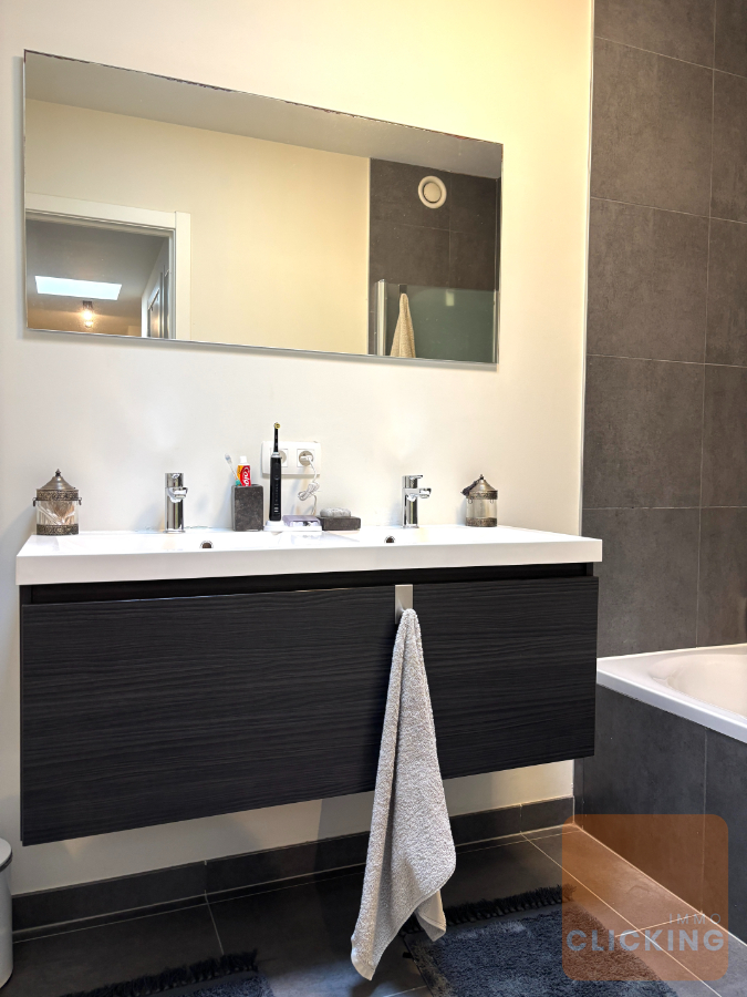 Een trap brengt je naar de tweede verdieping, waar zich twee comfortabele slaapkamers (11,9m2 en 14,70m2) en een stijlvolle badkamer ligbad douche en twee wastafels bevinden. Extra praktisch: een aparte berging op het gelijkvloers.